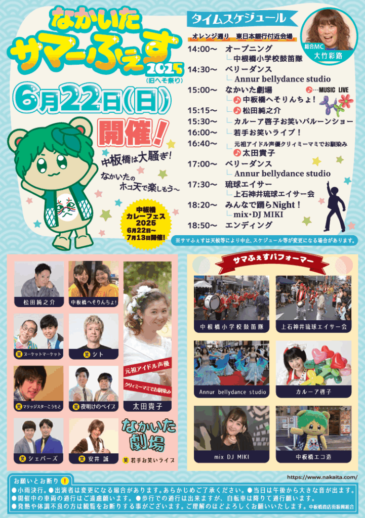 Le Nakaita Summer Fes 2025 se tiendra le dimanche 22 juin 2025 de 14h00 à environ 19h00, dans le quartier commerçant de Nakaitabashi, à Tokyo.