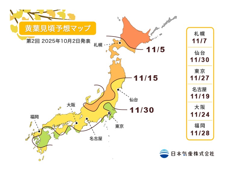 Des températures élevées sont attendues dans tout le pays cet automne 2025. Les meilleures périodes pour admirer l'automne et le jaunissement des feuilles sont les suivantes :