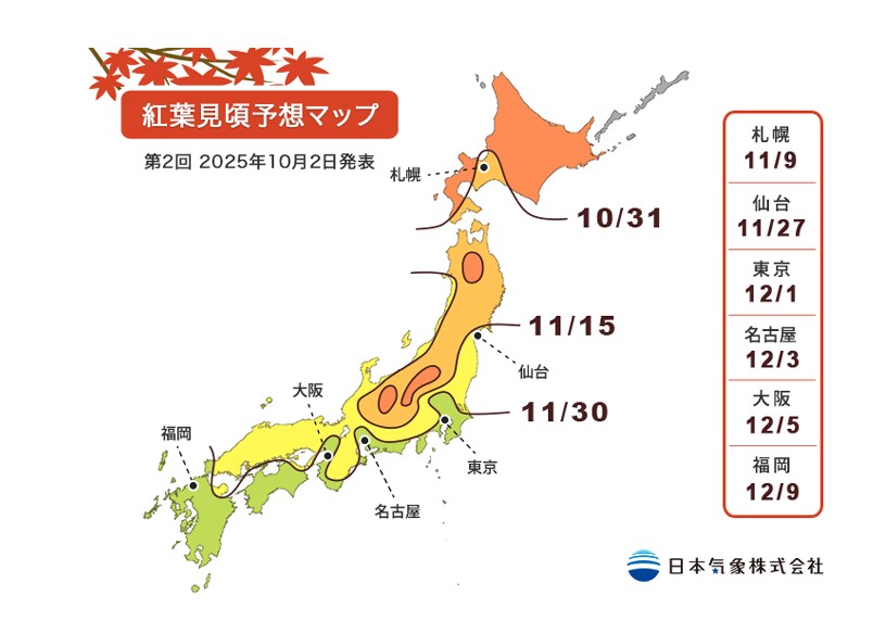 Voici les dernières nouvelles avec la dernière prévision annoncée par l'association de météorologie japonaise le 02 Octobre 2025. De plus, la JMC fourni les prévisions du meilleur moment pour voir les feuilles d'automne pour chaque altitude d'environ 2000 montagnes à l'échelle nationale.